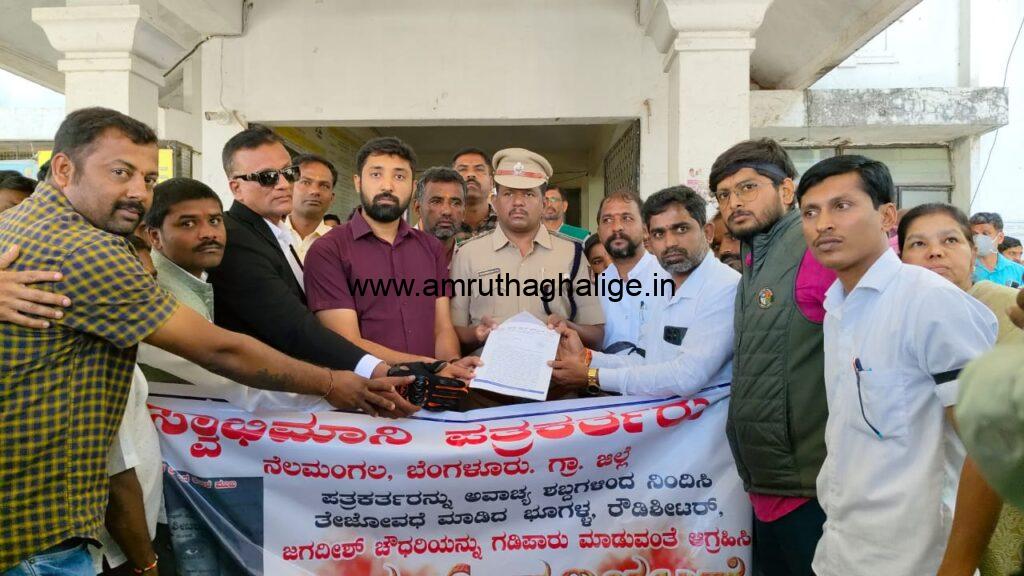 ಬೆಂಗಳೂರು ಗ್ರಾಮಾಂತರ ಜಿಲ್ಲೆ ನೆಲಮಂಗಲ ತಾಲ್ಲೂಕು ಪತ್ರಕರ್ತರನ್ನು ಬಿಜೆಪಿ ತಾಲ್ಲೂಕು ಅಧ್ಯಕ್ಷ ಜಗದೀಶ್ ಚೌದ್ರಿ ಅವಾಚ್ಯ ಶಬ್ದಗಳಿಂದ ನಿಂದಿಸಿ ಧಮ್ಕಿ ಹಾಕಿರುವ ವಿಚಾರವಾಗಿ ನೆಲಮಂಗಲ ತಾಲ್ಲೂಕು ಸ್ವಾಭಿಮಾನಿ ಪತ್ರಕರ್ತರುಗಳು ಪ್ರೆಸ್ ಕ್ಲಬ್ ಕೌನ್ಸಿಲ್ ನೇತೃತ್ವದಲ್ಲಿ ನೆಲಮಂಗಲ ತಾಲ್ಲೂಕು ಕಚೇರಿ ಎದುರು ಜಗದೀಶ್ ಚೌದ್ರಿ ವಿರುದ್ಧ ಬೃಹತ್ ಪ್ರತಿಭಟನೆ ನಡೆಸಿ ರೌಡಿ ಶೀಟರ್ ಜಗದೀಶ್ ಚೌದ್ರಿರವರನ್ನು ಗಡಿಪಾರು ಮಾಡುವಂತೆ ಆಗ್ರಹಿಸಿದರು.