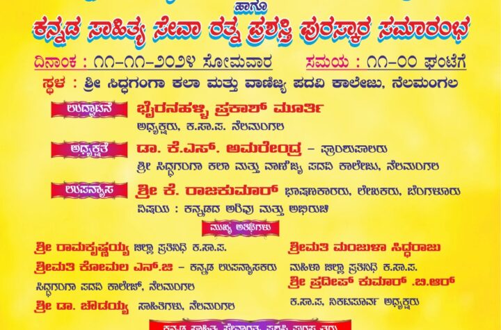 ಕನ್ನಡ ಸಾಹಿತ್ಯ ಅಭಿರುಚಿ ಕಾರ್ಯಕ್ರಮ ಹಾಗೂ ಕನ್ನಡ ಸಾಹಿತ್ಯ ಸೇವಾರತ್ನ ಪ್ರಶಸ್ತಿ ಸಮಾರಂಭ . ದಿನಾಂಕ ೧೧:೧೧೨೦೨೪...